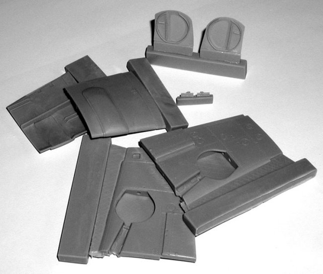 | Bf 109G/K-4 Super Detailed Main Wheel Wells & Top Wing for all Hasegawa Bf 109s with large tires and large overwing bulges. This set replaces the inboard lower kit wing with a part that contains a wheel well of the proper depth. After cutting off the thin casting sheeting over the wheel well, you place our resin "cap" on top of the opening. | ||