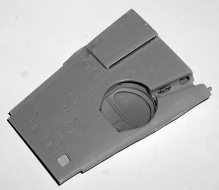 | Then, you open up the thin casting sheeting covering the kidney-shaped hole in the well cap. Finally, you replace the kit inboard upper wing with our part, which has the underside of the wheel well bulge already hollowed out. This combination gives you 1) a wheel well of the proper depth, 2) a detailed well "cap" (in reality it was the underside of the top wing skin, including the stiffeners), and 3) true three-dimensional effect of the wheel well, cap, and you can see the underside of the wheel well bulge though the kidney shaped hole in the wheel well cover. Cool! |